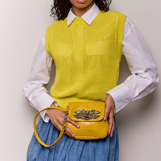 Vintage 1970s Yellow Leather Bag With Antique Brass Eagle