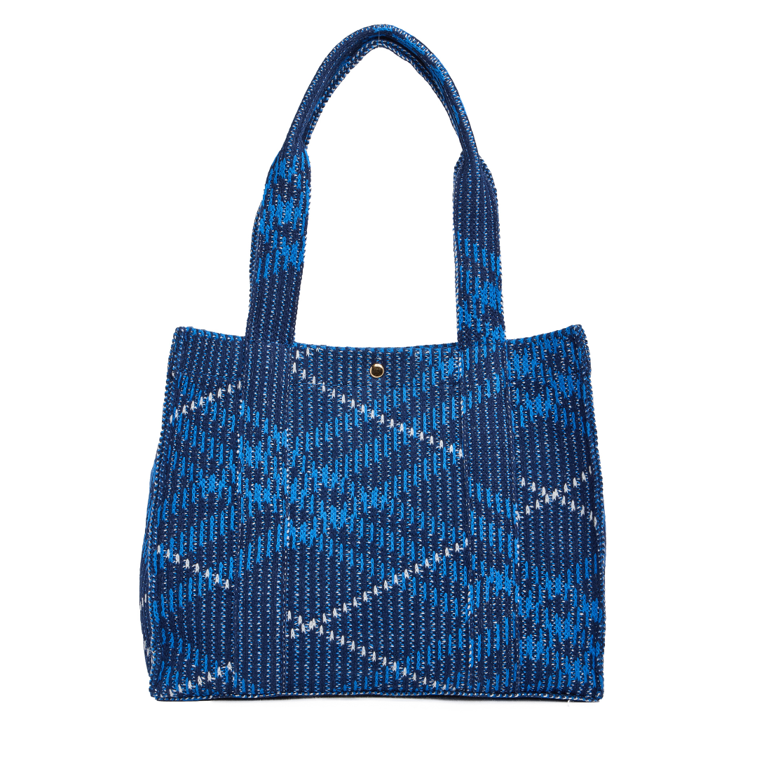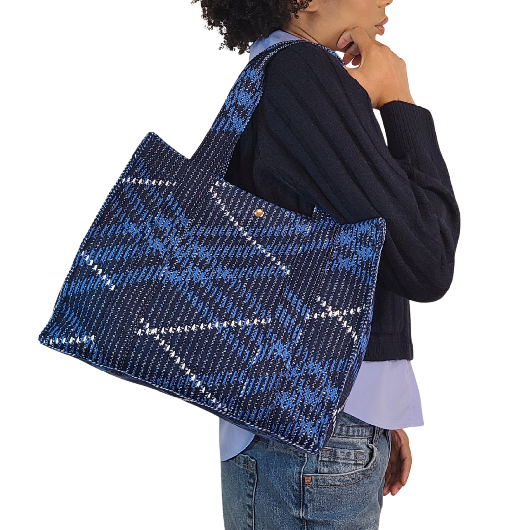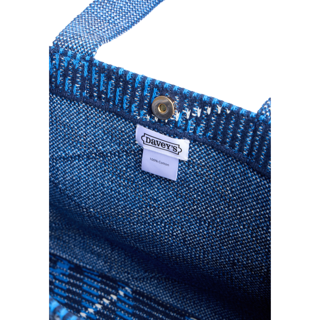 The Front Street Tote is a softly-structured bag with a vibrant plaid pattern. It's lightweight, 100% cotton, and features a magnetic snap closure and two shoulder straps. Each bag is made on a sweater knitting machine, hand-assembled and has a hand-sewn Davey's label inside. Hurry, they're in limited quantities.