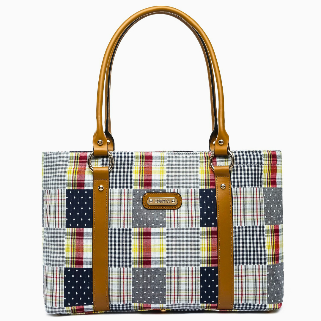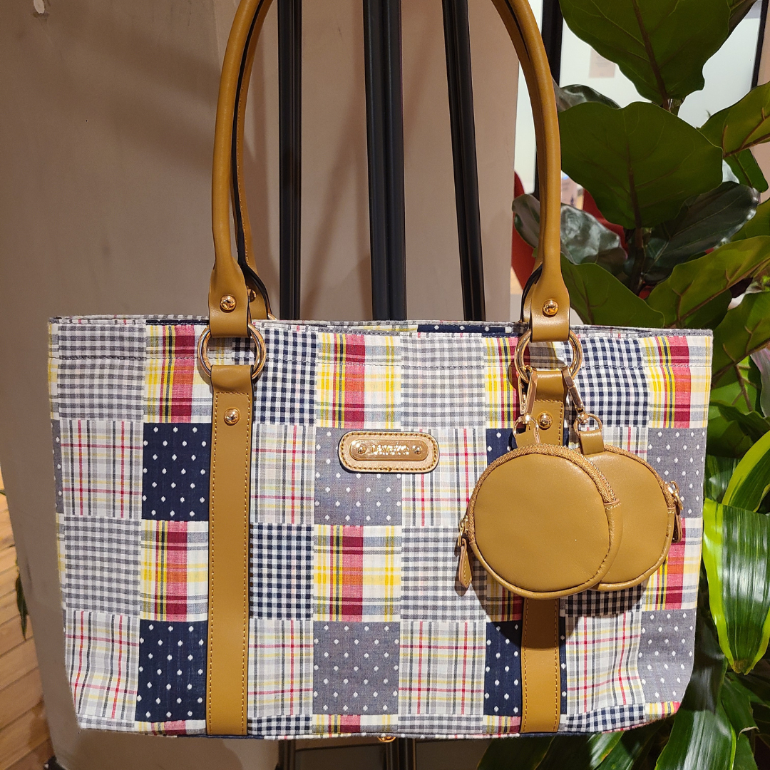 Features soft navy, white, grey, yellow and red printed patchwork plaid cotton with smooth leather trim and gold-tone hardware; open top with leather tab snap closure; rear slit pocket; dual top handles that fit over shoulder for easy carrying and Davey's embossed logo plaque that can be interchanged with a custom-engraved monogram plaque.