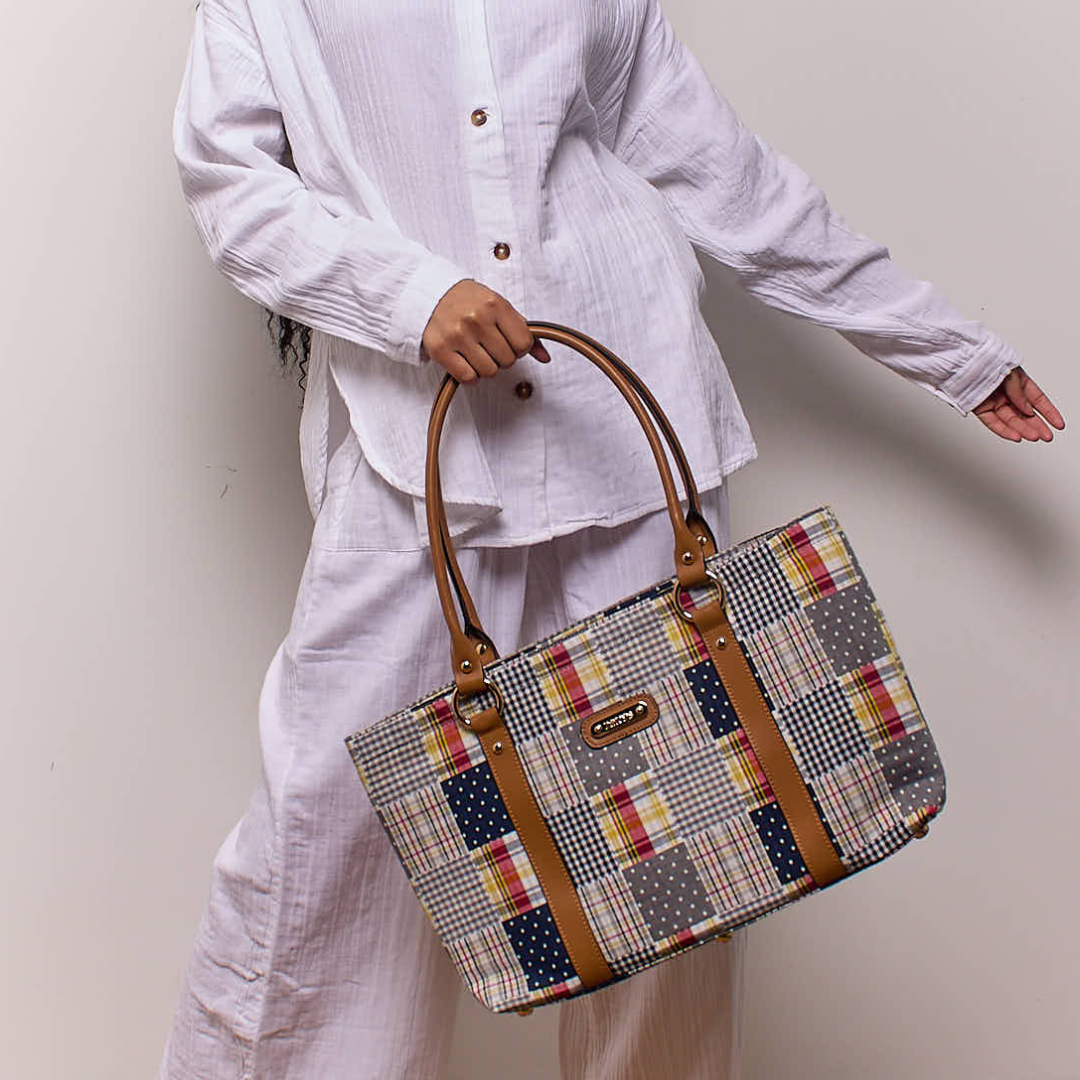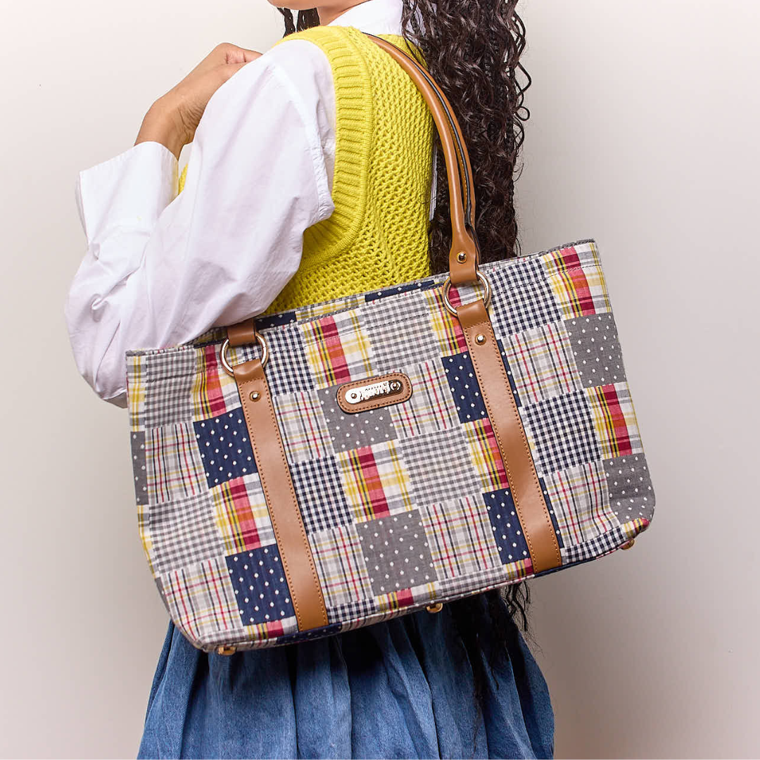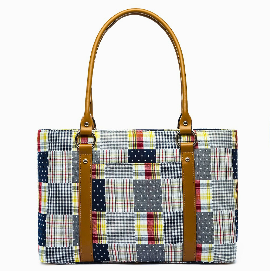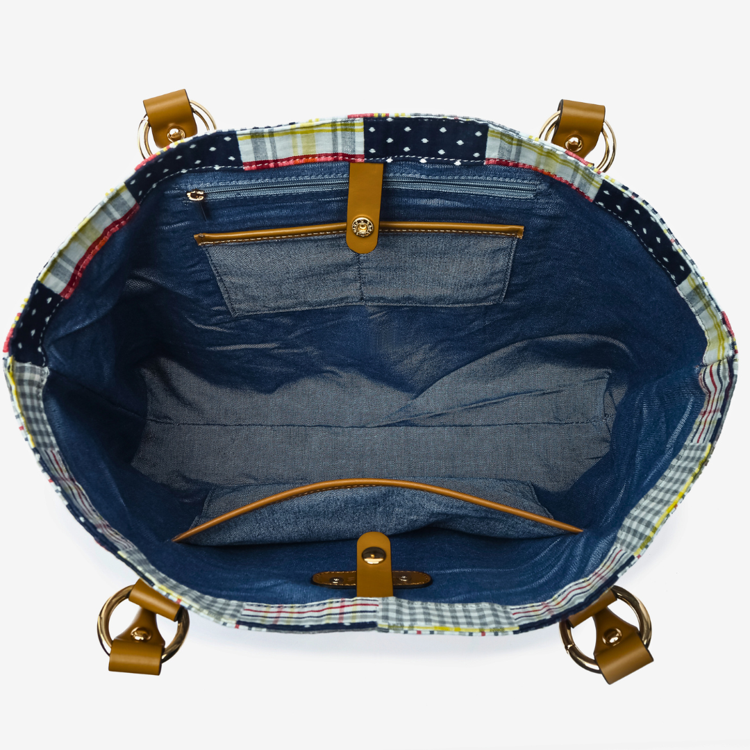 Large Tote - Navy Plaid Patchwork