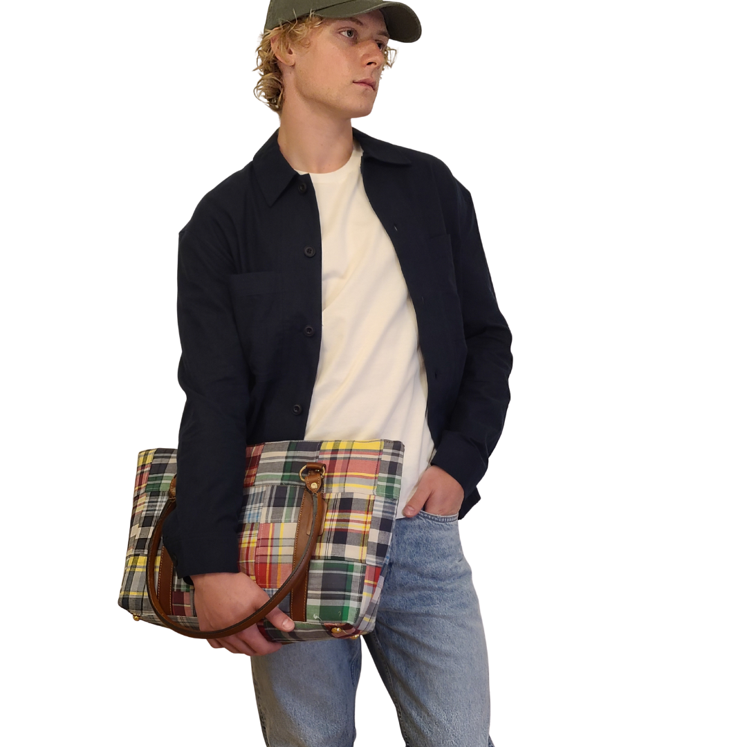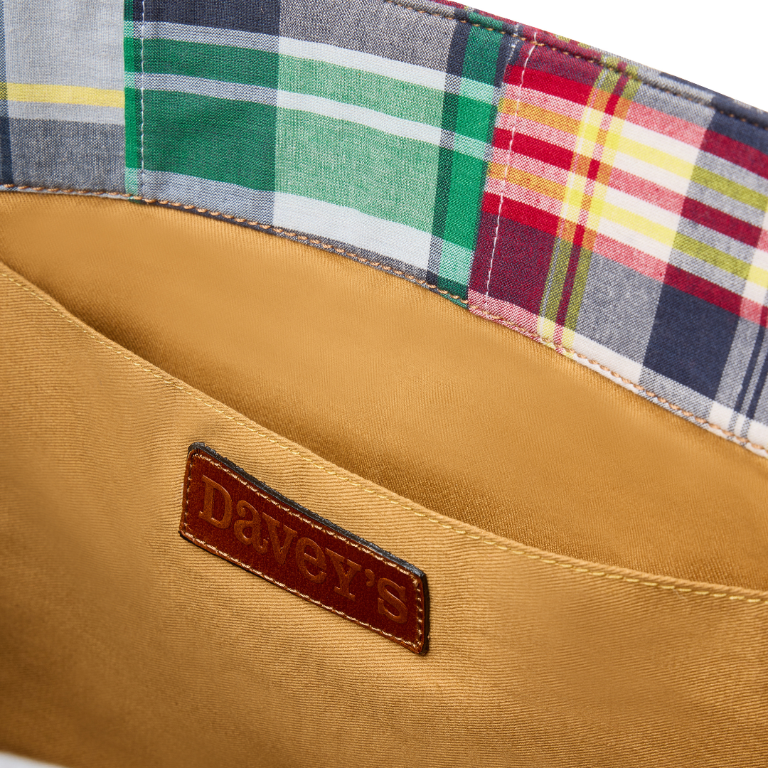 Meet Davey's Madras Patchwork Plaid Tote Bag. Handcrafted in India, this tote combines 100% cotton madras patchwork and soft leather trim, paying homage to Davey's heritage and the classic preppy trend.