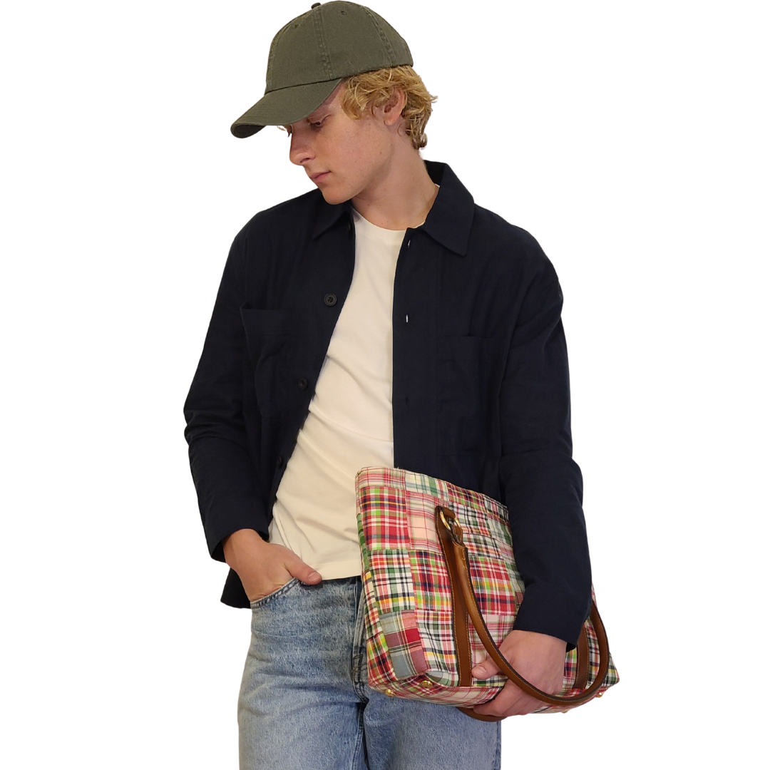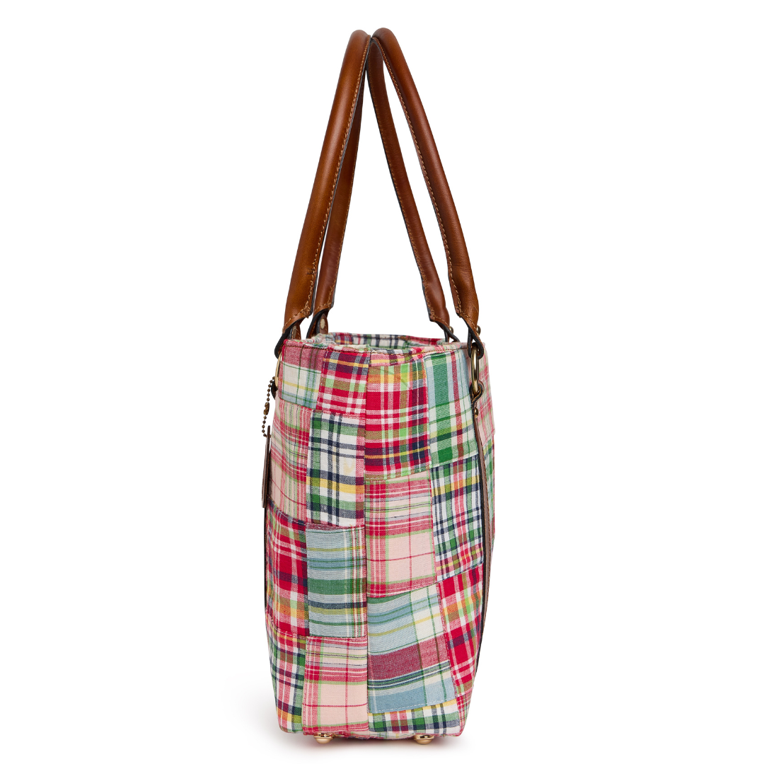 Meet Davey's Madras Patchwork Plaid Tote Bag. Handcrafted in India, this tote combines 100% cotton madras patchwork and soft leather trim, paying homage to Davey's heritage and the classic preppy trend.