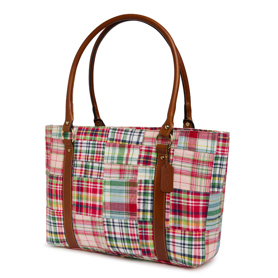 Features Nantucket red, green and white patchwork madras with leather trim and gold-tone hardware; open top; one rear slit pocket; dual top handles that fit easily over shoulder, 4 brass feet on bottom panel and Davey's embossed leather hangtag with gold detachable chain .