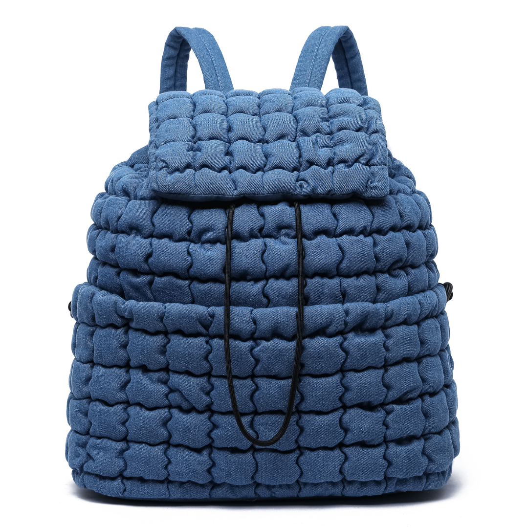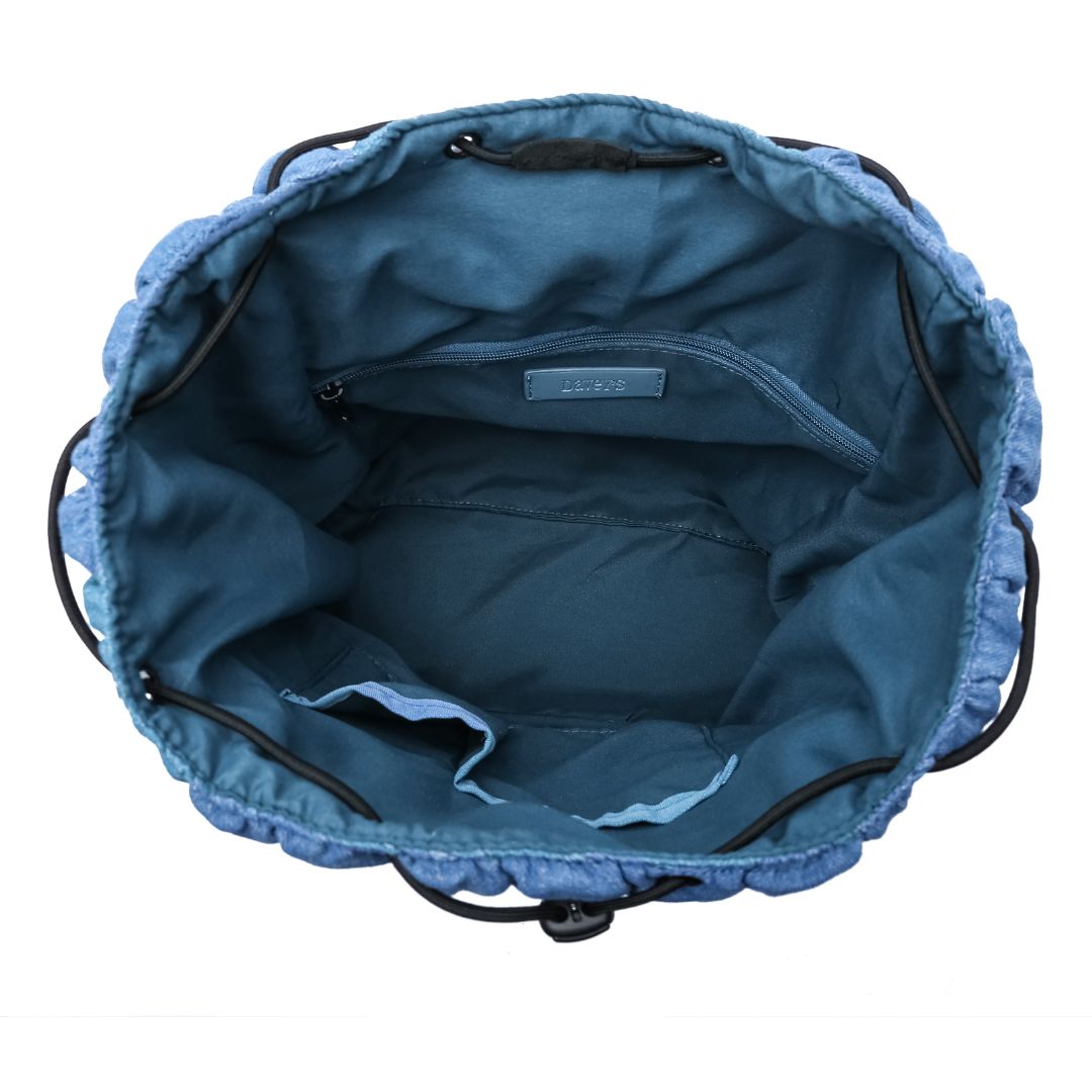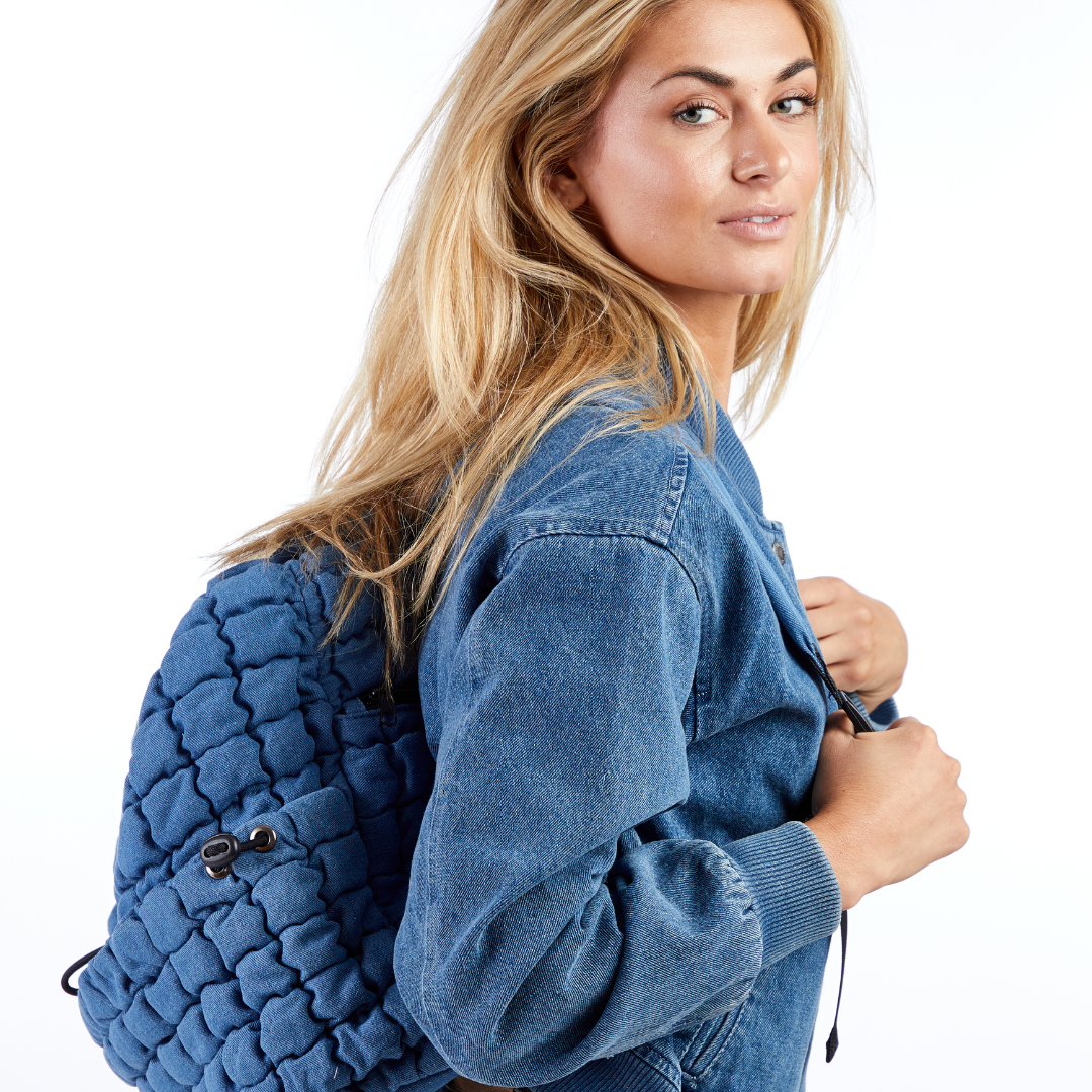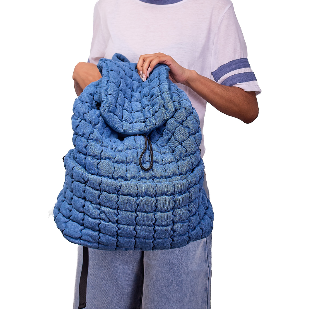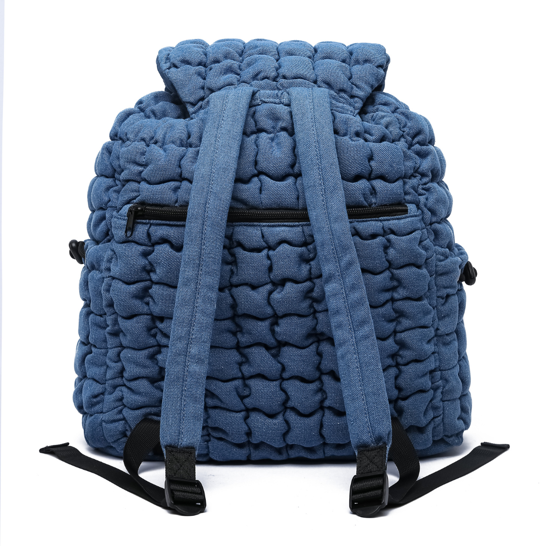 Features quilted fabrication, slouchy unstructured silhouette, flap top with a drawstring and snap button closure, adjustable shoulder straps, bungee cord drawstrings at side pockets, lined interior with a zippered pocket, exterior pocket at front, hidden zippered pocket at back.
