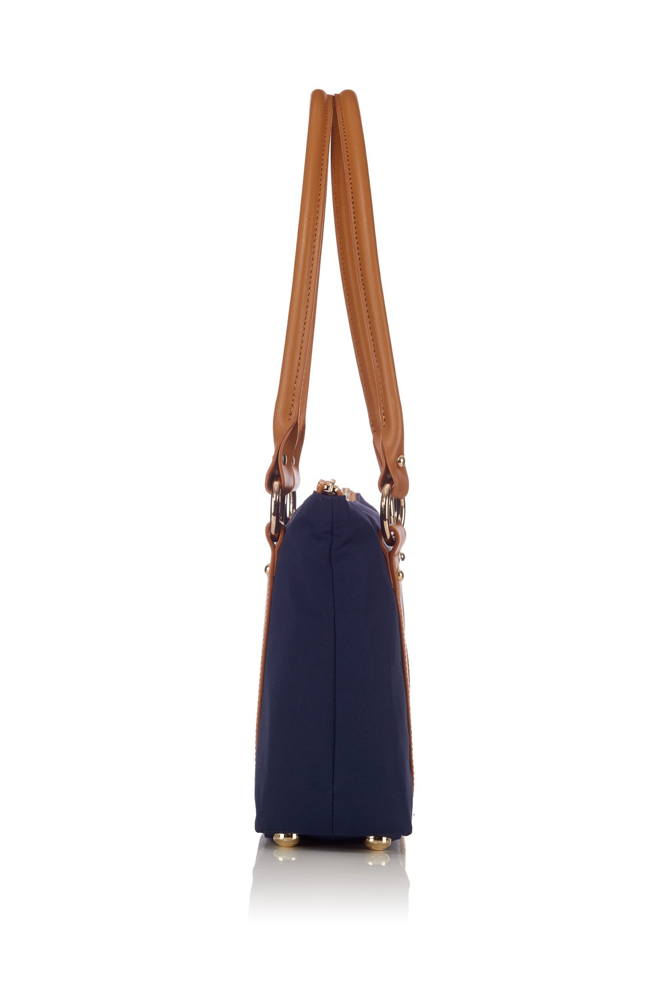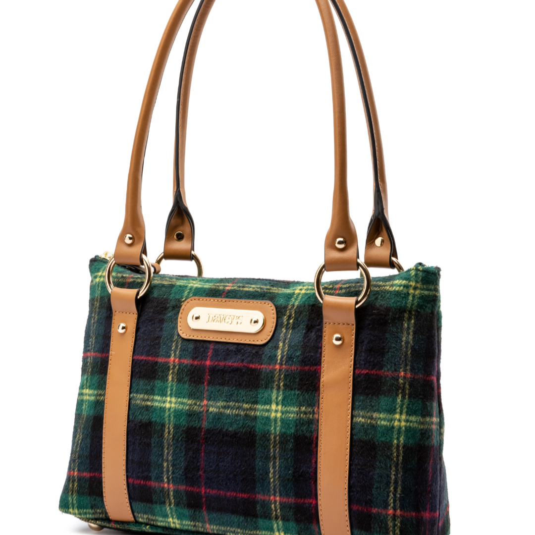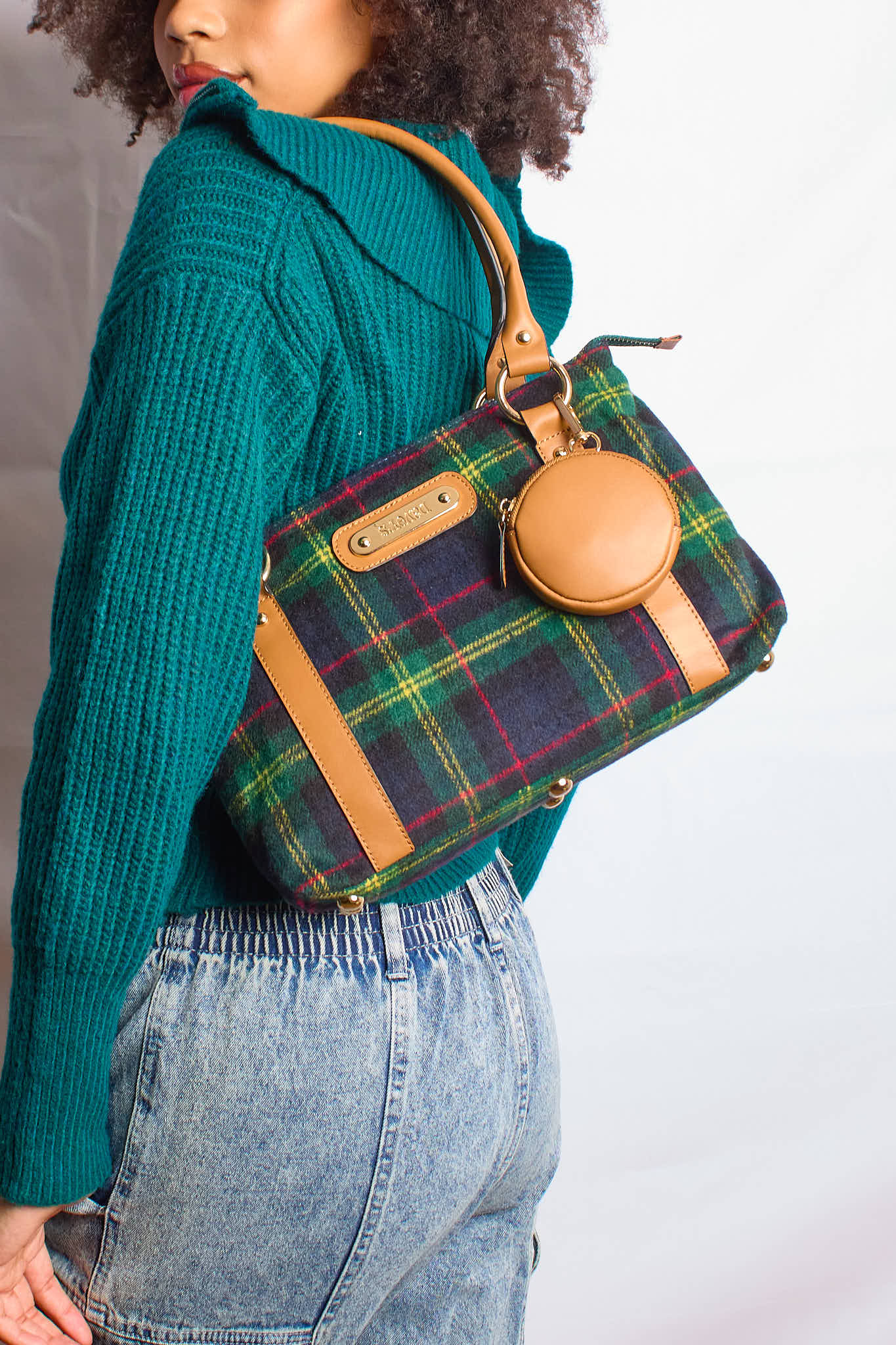 Small Tote in an up-cycled navy wool blend plaid. Features smooth tan leather trim and gold-tone hardware, concealed slit pocket at rear, inset zip top closure with leather pull, dual top handles fit over shoulder for easy carrying and six protective feet at base.