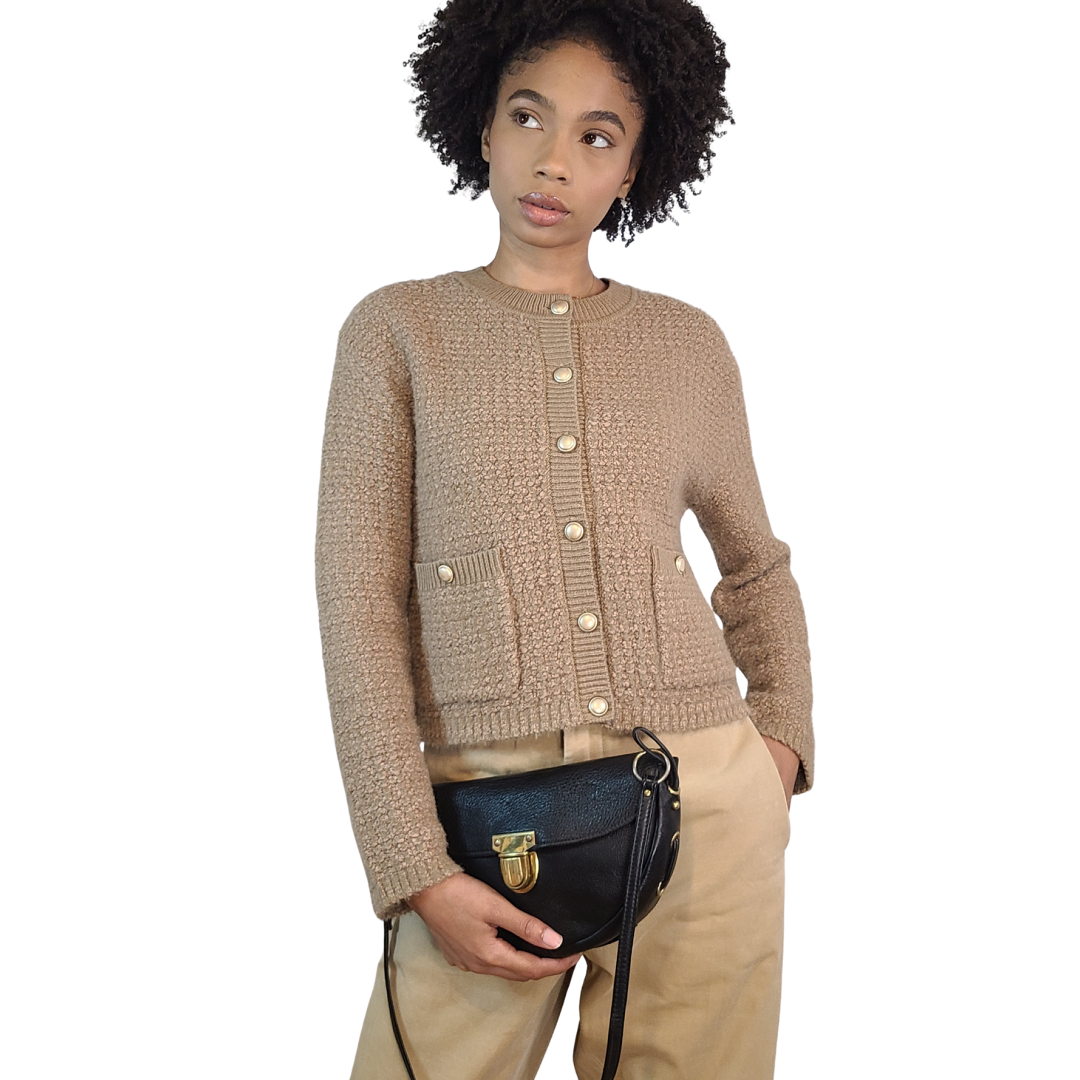 Exterior features genuine leather and brass hardware, single adjustable leather shoulder strap, front fold-over flap with push lock closure and brass decorative grommet detail on gusset. Interior features suede lining and original Davey's label. Excellent vintage condition.